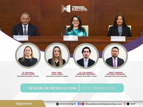 Transmisión de Sesiones Públicas ... Sesiones públicas anteriores ... Expedientes Años Anteriores Del año 1997 al 2025 Acuerdo General Plenario 1/2026 del Tribunal Electoral del Estado de Nuevo León, por el que se determina el calendario oficial de labores para el año 2026 INFORME DE ACTIVIDADES DE PRESIDENCIA, PERIODO 07 DE DICIEMBRE 2024-30 DE SEPTIEMBRE 2025. Acuerdo Plenario conclusión del Proceso Electoral 2023-2024. Lineamientos de Notificaciones Electrónicas, Tribunal Virtual y Juicio en Línea (Texto vigente, aprobado mediante acta ordinaria del Pleno de 07 de Septiembre de 2022) Acuerdo general plenario 5/2020 del Tribunal Electoral del Estado de Nuevo León por el que se implementan las reglas para tramitar medidas de protección en asuntos de violencia política en contra de las mujeres en razón de género, derivado de los diversos medios de impugnación. Este acuerdo entra en vigor el día 3 de junio, día en que fue publicado en el Periódico Oficial del Estado. Sentencias Año en curso Consulte los expedientes para garantizar la transparencia de nuestros asuntos. Ver todas Información Jurisdiccional Lista de acuerdos Notificación por estrados Estrados Sesiones públicas-Convocatorias Notificaciones no jurisdiccionales Catalogo de sujetos sancionados Sentencias 2026 Expedientes administrativos< seleccionar > Procedimiento Ordinario Sancionador< seleccionar > Procedimiento Especial Sancionador< seleccionar > Juicios de inconformidad< seleccionar > Recurso de apelación< seleccionar > Juicio para la Protección de los Derechos Político-Electorales del Ciudadano< seleccionar > Juicio Electoral< seleccionar >2 - YAHIR DE LA LUZ TRINIDAD vs COMISIÓN DE QUEJAS Y DENUNCIAS DEL INSTITUTO ESTATAL ELECTORAL Y DE PARTICIPACIÓN CIUDADANA1 - YAHIR DE LA LUZ TRINIDAD vs COMISION DE QUEJAS Y DENUNCIAS DEL INSTITUTO ESTATAL ELECTORAL Y DE PARTICIPACIÓN CIUDADANA DE NL Cuaderno de Asuntos Generales< seleccionar > Recurso de Reconsideración< seleccionar > Noticias Información relevante y boletines de prensa para informar sobre nuestro quehacer. 22 Ene 26 Sesión de Resolución 15 Ene 26 Sesión de Resolución Ver más noticias Unidad de Equidad de Género ¡Conoce las resoluciones en materia de Violencia Política en Razón de Género!