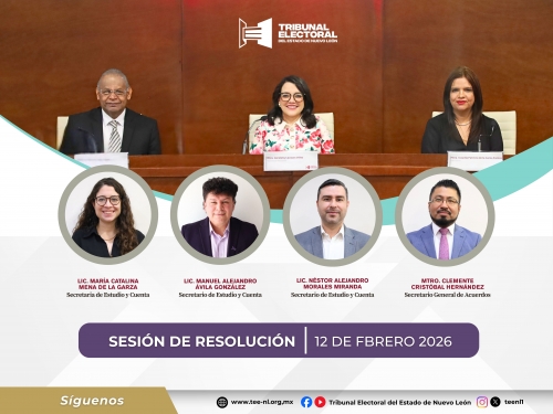 Transmisión de Sesiones Públicas ... Sesiones públicas anteriores ... Expedientes Años Anteriores Del año 1997 al 2025 Calendario Oficial de Labores para el año 2026 Acuerdo General Plenario 1/2026 del Tribunal Electoral del Estado de Nuevo León, por el que se determina el calendario oficial de labores para el año 2026 INFORME DE ACTIVIDADES DE PRESIDENCIA, PERIODO 07 DE DICIEMBRE 2024-30 DE SEPTIEMBRE 2025. Acuerdo Plenario conclusión del Proceso Electoral 2023-2024. Lineamientos de Notificaciones Electrónicas, Tribunal Virtual y Juicio en Línea (Texto vigente, aprobado mediante acta ordinaria del Pleno de 07 de Septiembre de 2022) Acuerdo general plenario 5/2020 del Tribunal Electoral del Estado de Nuevo León por el que se implementan las reglas para tramitar medidas de protección en asuntos de violencia política en contra de las mujeres en razón de género, derivado de los diversos medios de impugnación. Este acuerdo entra en vigor el día 3 de junio, día en que fue publicado en el Periódico Oficial del Estado. Sentencias Año en curso Consulte los expedientes para garantizar la transparencia de nuestros asuntos. Ver todas Información Jurisdiccional Lista de acuerdos Notificación por estrados Estrados Sesiones públicas-Convocatorias Notificaciones no jurisdiccionales Catalogo de sujetos sancionados Sentencias 2026 Expedientes administrativos< seleccionar > Procedimiento Ordinario Sancionador< seleccionar > Procedimiento Especial Sancionador< seleccionar > Juicios de inconformidad< seleccionar > Recurso de apelación< seleccionar > Juicio para la Protección de los Derechos Político-Electorales del Ciudadano< seleccionar > Juicio Electoral< seleccionar >2 - YAHIR DE LA LUZ TRINIDAD vs COMISIÓN DE QUEJAS Y DENUNCIAS DEL INSTITUTO ESTATAL ELECTORAL Y DE PARTICIPACIÓN CIUDADANA1 - YAHIR DE LA LUZ TRINIDAD vs COMISION DE QUEJAS Y DENUNCIAS DEL INSTITUTO ESTATAL ELECTORAL Y DE PARTICIPACIÓN CIUDADANA DE NL Cuaderno de Asuntos Generales< seleccionar > Recurso de Reconsideración< seleccionar > Noticias Información relevante y boletines de prensa para informar sobre nuestro quehacer. 12 Feb 26 Conversatorio “El impacto del liderazgo femenino en la función pública electoral”. 12 Feb 26 Sesión de Resolución Ver más noticias Unidad de Equidad de Género ¡Conoce las resoluciones en materia de Violencia Política en Razón de Género!