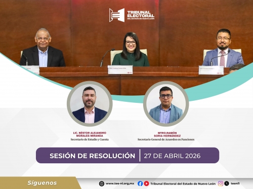 Transmisión de Sesiones Públicas ... Sesiones públicas anteriores ... Expedientes Años Anteriores Del año 1997 al 2025 Calendario Oficial de Labores para el año 2026 Acuerdo General Plenario 1/2026 del Tribunal Electoral del Estado de Nuevo León, por el que se determina el calendario oficial de labores para el año 2026 INFORME DE ACTIVIDADES DE PRESIDENCIA, PERIODO 07 DE DICIEMBRE 2024-30 DE SEPTIEMBRE 2025. Acuerdo Plenario conclusión del Proceso Electoral 2023-2024. Lineamientos de Notificaciones Electrónicas, Tribunal Virtual y Juicio en Línea (Texto vigente, aprobado mediante acta ordinaria del Pleno de 07 de Septiembre de 2022) Acuerdo general plenario 5/2020 del Tribunal Electoral del Estado de Nuevo León por el que se implementan las reglas para tramitar medidas de protección en asuntos de violencia política en contra de las mujeres en razón de género, derivado de los diversos medios de impugnación. Este acuerdo entra en vigor el día 3 de junio, día en que fue publicado en el Periódico Oficial del Estado. Sentencias Año en curso Consulte los expedientes para garantizar la transparencia de nuestros asuntos. Ver todas Información Jurisdiccional Lista de acuerdos Notificación por estrados Estrados Sesiones públicas-Convocatorias Notificaciones no jurisdiccionales Catalogo de sujetos sancionados Sentencias 2026 Expedientes administrativos< seleccionar > Procedimiento Ordinario Sancionador< seleccionar >14 - JOSÉ ISRAEL GARIBAY GARZA vs LUIS EDUARDO CAVAZOS MORALES 13 - DIEGO CORREA GARAY vs LUIS FERNANDO DOMÍNGUEZ MARTIN DEL CAMPO12 - MIGUEL ÁNGEL GARCÍA LECHUGA vs JESÚS ÁNGEL NAVA RIVERA11 - DIEGO GARAY CORREA vs IRAÍS VIRGINIA REYES DE LA TORRE Y OTROS10 - J.A.R.B vs GERARDO ALFONSO DE LA MAZA VILLARREAL9 - J.A.R.B vs GERARDO ALFONSO DE LA MAZA VILLARREAL8 - J.A.R.B vs GERARDO ALFONSO DE LA MAZA VILLARREAL7 - J.A.R.B vs GERARDO ALFONSO DE LA MAZA VILLARREAL6 - J.A.R.B vs GERARDO ALFONSO DE LA MAZA VILLARREAL5 - J.A.R.B vs GERARDO ALFONSO DE LA MAZA VILLARREAL4 - J.A.R.B vs GERARDO ALFONSO DE LA MAZA VILLARREAL3 - J.A.R.B vs GERARDO ALFONSO DE LA MAZA VILLARREAL2 - J.A.R.B. vs AYUNTAMIENTO DE EL CARMEN, NUEVO LEÓN Y GERARDO ALFONSO DE LA MAZA VILLARREAL1 - J.A.R.B vs GERARDO ALFONSO DE LA MAZA VILLARREAL Procedimiento Especial Sancionador< seleccionar >VPMRG-2 - ALEJANDRA CRUZ SANCHEZ vs MANUEL GUERRA CAVAZOS Y OTROS Juicios de inconformidad< seleccionar > Recurso de apelación< seleccionar > Juicio para la Protección de los Derechos Político-Electorales del Ciudadano< seleccionar > Juicio Electoral< seleccionar >5 - PARTIDO ACCIÓN NACIONAL vs H. CONGRESO DEL ESTADO4 - MANUEL GUERRA CAVAZOS vs COMISION DE QUEJAS Y DENUNCIAS DEL IEEPCNL 3 - JIMENA LUNA SALDAÑA vs INSTITUTO ESTATAL ELECTORAL Y DE PARTICIPACION CIUDADANA DEL ESTADO DE NUEVO LEÓN.2 - YAHIR DE LA LUZ TRINIDAD vs COMISIÓN DE QUEJAS Y DENUNCIAS DEL INSTITUTO ESTATAL ELECTORAL Y DE PARTICIPACIÓN CIUDADANA1 - YAHIR DE LA LUZ TRINIDAD vs COMISION DE QUEJAS Y DENUNCIAS DEL INSTITUTO ESTATAL ELECTORAL Y DE PARTICIPACIÓN CIUDADANA DE NL Cuaderno de Asuntos Generales< seleccionar > Recurso de Reconsideración< seleccionar > Noticias Información relevante y boletines de prensa para informar sobre nuestro quehacer. 27 Abr 26 Sesión de Resolución 15 Abr 26 Sesión de Resolución Ver más noticias Unidad de Equidad de Género ¡Conoce las resoluciones en materia de Violencia Política en Razón de Género!